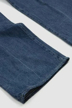 This denim is woven slowly on a shuttle loom using short-fiber nep yarn for the warp and high-quality suvin cotton for the weft. The warp is made of staple fibers to give it a fluffy, vintage look, while the weft is made of beautiful long fibers to give it an elegant fullness and soft texture. Repeated soaping, wrinkling, and bleaching processes all done by hand by skilled craftsmen produce a unique individual pattern with characteristic color fading.