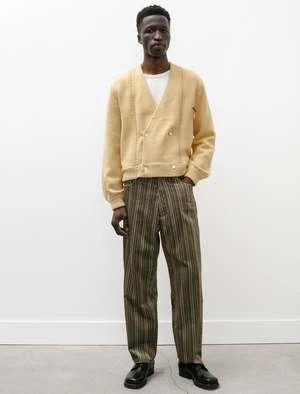 A relaxed fitting, straight leg pant cut from a striped, Italian cotton velvet in mixed green tones. Feature a buttonless zipper closure, classic denim four pocket styling, and a long rise. Camiel Fortgens’ signature deconstructed finish presents with raw edges along the waistline, hem, pockets, and belt loops as well as the signature wavy top stitching throughout. Sewn with flat felled seams through the seat for added durability, belt loops reinforced with bar tacks.