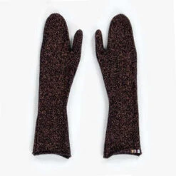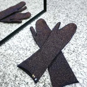 Long mittens in the brand’s signature cashmere blend knit in navy color plus a touch of sparkly metallic thread in copper color.
