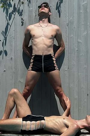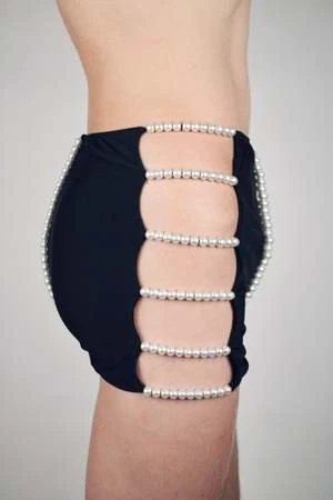 This unique pair of high-waisted swim trunks is inspired by midcentury swimwear for men and women. Romanticizing sensuality from another era that features our brand’s signature high-waisted silhouette, these shorts are constructed with separate front and back panels that are strung together by strands of pearls. Cut-out on each side of the bathing suit creates fun pee-a-boo moments to show off your gams. Body conscious fit to complement your natural shape. Featuring our logo embroidery.