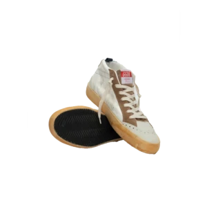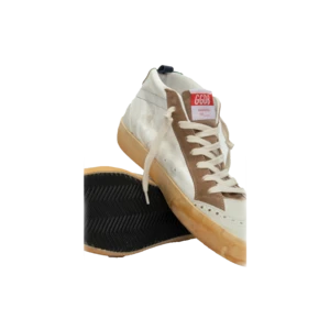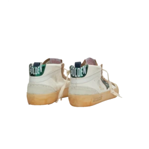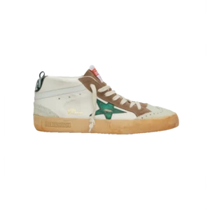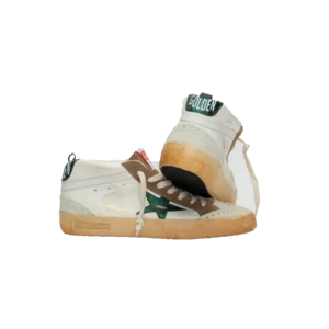 Mid Star sneakers are inspired by the skate scene of the Eighties, but with a refined approach. In this model, the white leather upper meets the star and the green heel tab with laminated effect, contrasting beige suede details.