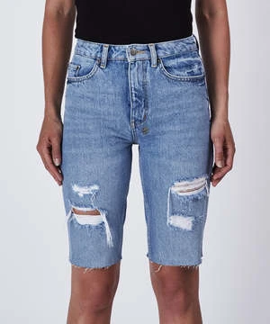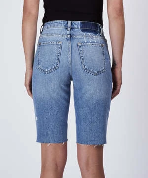 The App Laye Shorts come in a slightly longer length that grazes the mid thigh. This style is made of rigid 100% cotton European denim with heavy stonewash and vintage highlights and trashing. It also features a mid rise, slim fit, classic five pocket styling, branded hardware, cross embroidery at the reverse and a raw cut hemline.
