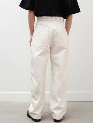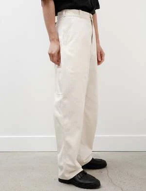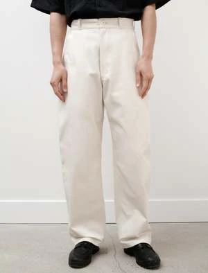 MAN-TLEs wide-fitting work pant is cut for ease of movement and constructed from an unbleached dense, high twist cotton twill. Named for traditional, Korean ritual dress, the new Jebok line from MAN-TLE is designed for durability suitable for industry. Features a Japanese made YKK zip fly, front slash pockets with smaller inner pocket on the left side, rear patch pockets, and a side seam patch pocket at right side. Durably finished with welt stitched felled seams, and seven single needle belt loops for a secure hold.