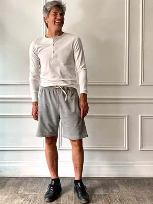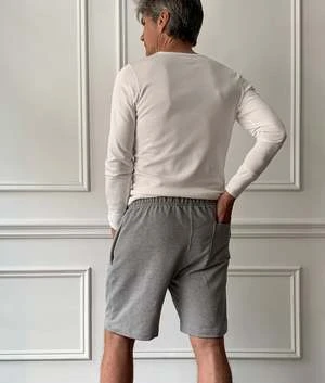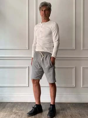Drawstring sweat shorts with side seam pockets and a single back pocket.