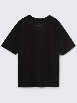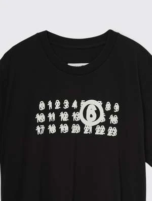 A basic jersey short-sleeve shirt marked by an intentionally faded copy machine print and the signature numeric on the front. MM6s signature stitching on the back of the garment.