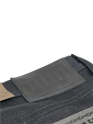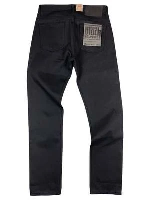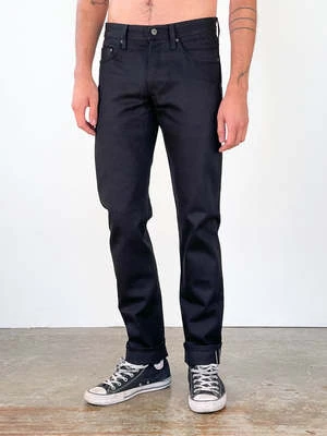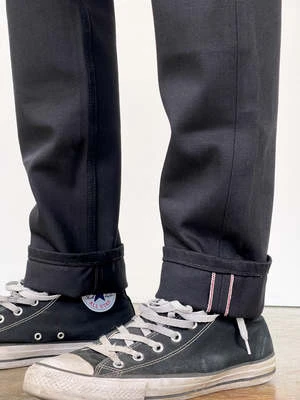 The Solid Black Selvedge is a 13oz black Japanese selvedge denim. Both the warp and weft are sulfur-dyed black to create a pitch-black denim. The denim is woven on vintage shuttle looms in a right hand twill construction with a classic red line selvedge ID. Cut, sewn, built in Canada with black stitching, a full-grain black leather Machus bar logo patch, and black metal buttons and rivets. The Weird Guy is a regular tapered fit; medium rise, standard thigh and slight taper from the knee to hem.