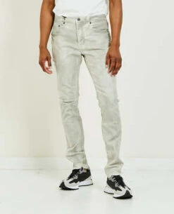 Sid jeans in overcast dirty by Neon Denim Brand. A slim fit low rise 5 pocket jeans with a dirty wash over a white denim base.