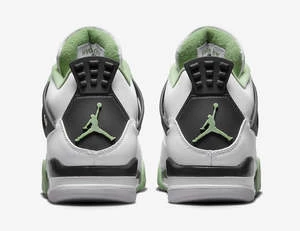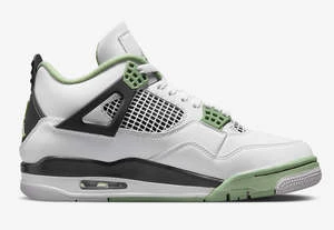 Dressed in a White, Seafoam, Dark Ash, and Neutral Grey color scheme. This offering of the Air Jordan 4 features a White leather upper highlighted with Seafoam Green contrasting accents. Black detailing with a Neutral Grey rubber outsole completes the design.