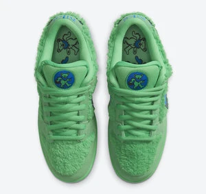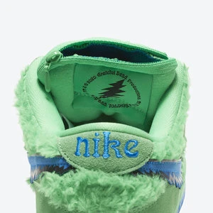 The Grateful Dead X Nike SB Dunk Low Green Bear Is One Of Three Extremely Sought After Colorways From The California Based Rock Bands Collaboration With Nike SB. Nike SB Produced A Swarm Of Exciting New And Original Designs In 2020 That Incorporate Elements Outside Of The Realm Of Sneaker Culture, With The Trio Of Grateful Dead Dunks Heading The Lineup. The Two-Toned Appearance Of The Upper Features Green Faux Fur On The Toe, Mid-Panel, And Heel As A Direct Reference To The Bands Marching Bears Characters Commonly Seen On Various Artworks For Grateful Dead Albums And Merchandise. The Motif Reappears In A Multicolor Design On The Insole. Tonal Suede Overlays Dot The Forefoot, Eyelets, And Heel. Branding Appears In The Form Of A Contrasting Blue Jagged Swoosh On The Mid-Panel, Blue Nike Embroidery On The Heel, And A Mini Marching Bear And Swoosh Logo Inside Of An Emblem On The Tongue. One Final Detail Of Note, The Hidden Stash Pocket Located On The Inside Of The Tongue Displays The Bands Steal Your Face Skull. CJ5378 300