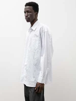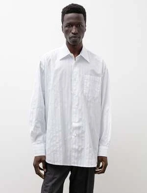 A generously oversized button front shirt cut from a crisp cotton shirting in optic white accented with sateen pinstripes in blue. Features a single patch pocket at the left breast, a two-piece clean finished yoke with generous box pleat, a jacquard script logo loop at the back neck, and pleated sleeves. Constructed using flat felled seams throughout for a hardwearing, yet elegant finish that will last many years to come. Completed with oversized mother of pearl buttons and mitered cuffs.