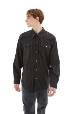 Our Legacy Frontier Shirt in Black Chalk Stripe. Produced in an Italian cotton fabric, the womens Frontier Shirt has a relaxed fit and features Italian pearlescent snap buttons, a straight hem and a western style shoulder yoke.