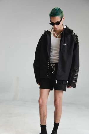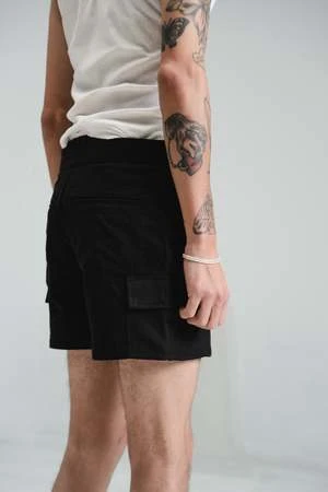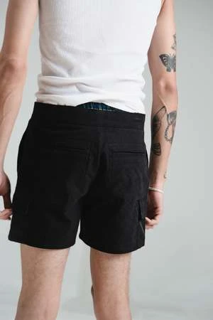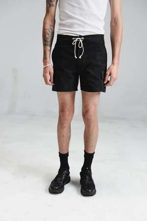 Our action shorts are a hybrid shape, midway between board shorts and workwear shorts. They feature a laced waistband with metal eyelets and recycled nylon patch pockets finished with metal rivets.