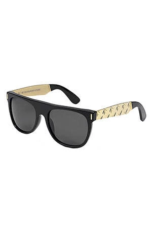 The timeless Flat Top silhouette in black with accented gold metal arms by Super. Engraved weed leaf design on the gold arms.