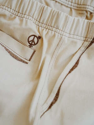 The Sex Hippies Welder’s Stitch Shorts in Creme Brle are a relaxed fit short constructed from a medium-weight cotton herringbone fabric. The shorts feature two front pockets, two rear welt pockets, and an elastic waist with an integrated adjustable jacquard belt. The Shorts are finished with contrasting brown “welder’s stitch” embroidery inspired by the hand-sewn embellishments welder’s sported on their caps and other garments, and a logo embroidery hit above the right rear pocket.