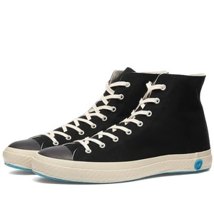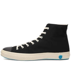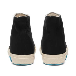 These black 01JP Highs from Shoes Like Pottery are fired in a kiln during production, in a similar fashion to traditional pottery. They sit canvas uppers on a vulcanized rubber sole unit and are finished with bold blue details throughout.