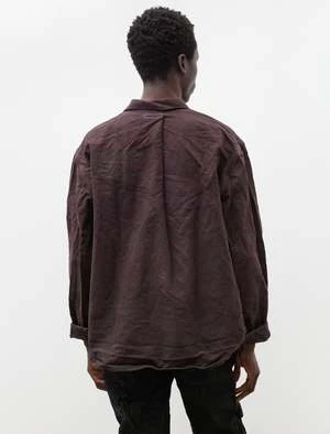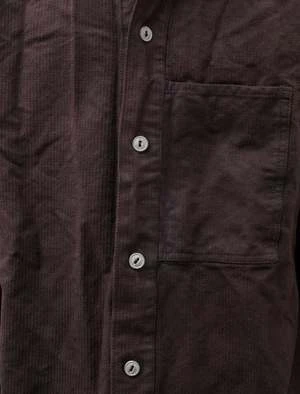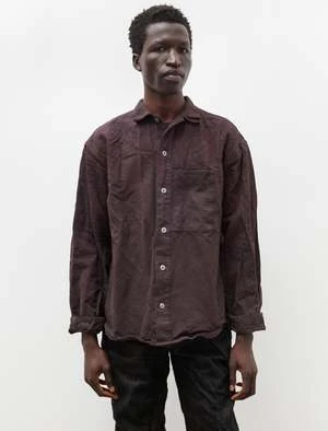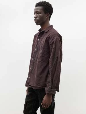 A generous fitting overshirt cut from a sturdy barley twist cotton with a textured stripe that has been dyed using a reactive dye method to a rich purple tinged brown. Features Tenders classic wrinkled collar, a left breast pocket set directly against the front placket, and a yokeless back with a generous knife pleat at the neckline. The generous body combines with a slightly dropped shoulder to create a voluminous silhouette that responds to the structure of the barley twist by creating a more sculptural form. Constructed with Tenders trademark emphasis on durability using chain stitched flat felled seams throughout with the signature wrinkled finish for a hard wearing final product that will last many years to come; hand cast pewter buttons, dropped rear hem.