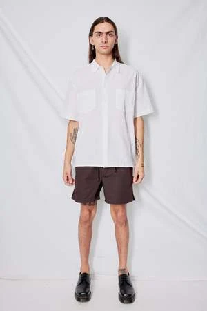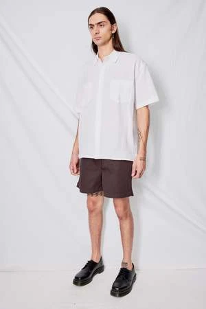 Brown Shorty Ripstop Shorts from YMC. Garment dyed organic cotton ripstop shorts cut just above the knee. Elasticated waistband. Angled side pockets and back patch pocket. Side seam vents at hem. Mock J stitch fly.